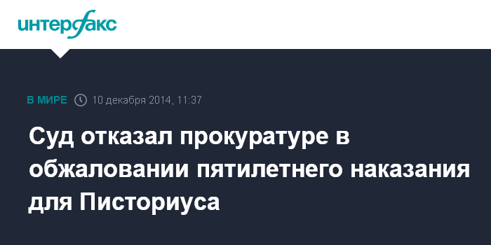 Москва. 10 декабря. INTERFAX.RU - Высокий суд Претории в ЮАР отказал прокуратуре в обжаловании пятилетнего срока тюремного заключения для паралимпийца Оскара Писториуса за непредумышленное убийство своей девушки, сообщает Sky Sports.