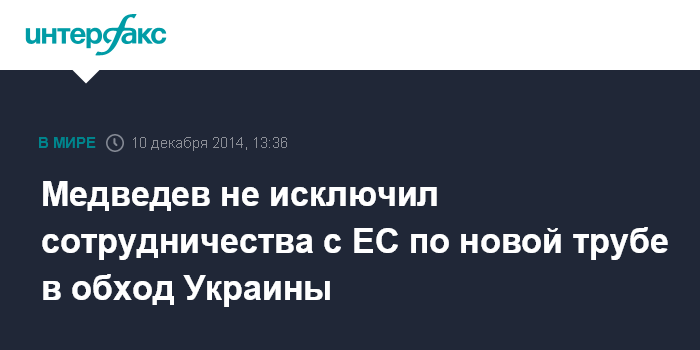 Москва. 10 декабря. INTERFAX.RU - Россия не исключает, что к проекту строительства нового газопровода через Черное море в Турцию и ЕС в обход Украины могут присоединиться и европейские партнеры, заявил премьер-министр РФ Дмитрий Медведев в интервью российским телеканалам.
