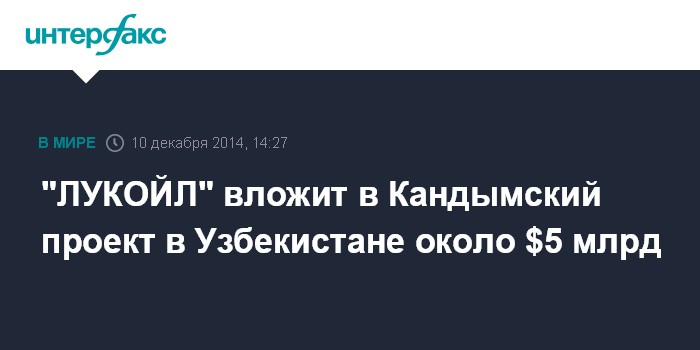 Москва. 10 декабря. INTERFAX.RU - "ЛУКОЙЛ" до 2039 года вложит в Кандымский проект в Узбекистане около $5 млрд, сообщил президент России Владимир Путин по итогам расширенных переговоров с президентом Узбекистана Исламом Каримовым.