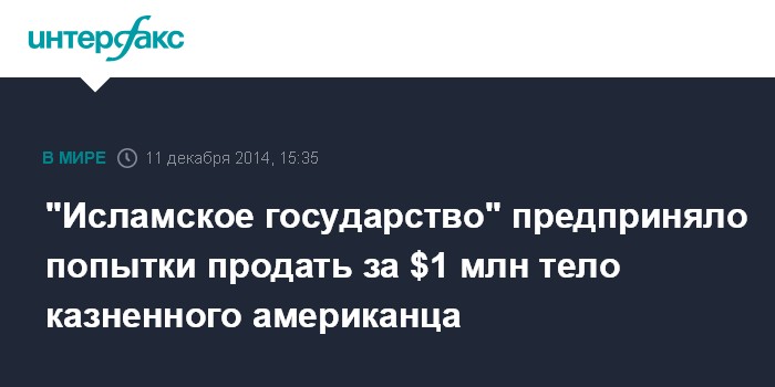 Москва. 11 декабря. INTERFAX.RU - "Исламское государство" предпринимают попытки продать за $1 млн тело обезглавленного боевиками в августе американского журналиста Джеймса Фоули американскому правительству или его семье, сообщает BuzzFeed News со ссылкой на собственные источники.