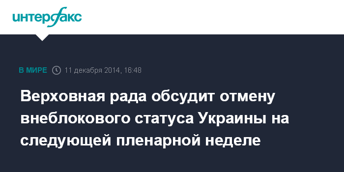 Москва. 11 декабря. INTERFAX.RU - Верховная рада рассмотрит вопрос об отмене внеблокового статуса Украины на следующей пленарной неделе, заявил спикер парламента Владимир Гройсман.