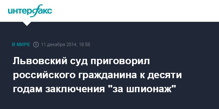 Москва. 11 декабря. INTERFAX.RU - Шевченковский райсуд Львова признал гражданина России виновным в преступлении, предусмотренном ч.1 ст.114 (шпионаж) УК Украины и назначил ему наказание в виде 10 лет тюрьмы.