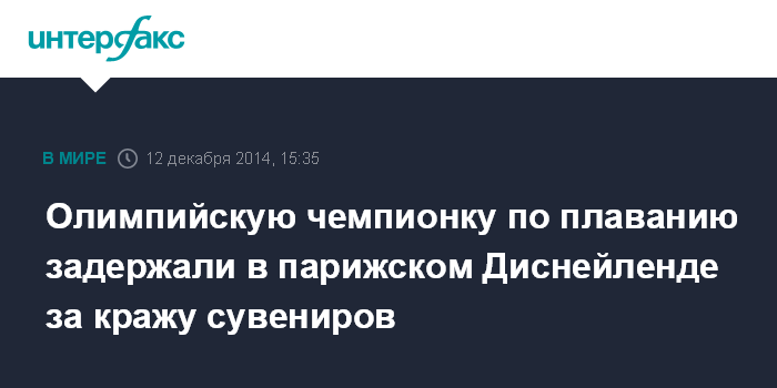 Москва. 12 декабря. INTERFAX.RU - Трехкратная французская олимпийская чемпионка по плаванию Лор Маноду была задержана в парке развлечений Диснейленд под Парижем за попытку кражи сувениров, сообщает в пятницу телеканал BFM-TV.