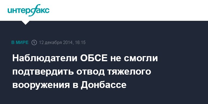 Москва. 12 декабря. INTERFAX.RU - Специальная мониторинговая миссия ОБСЕ не может подтвердить информацию об отводе тяжелого вооружения из зоны конфликта на востоке Украины и не исключает возможной эскалации ситуации в свете невыполнения минских договоренностей.
