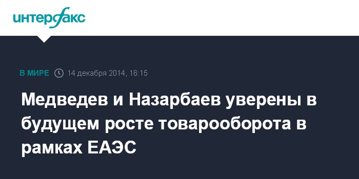 Москва. 14 декабря. INTERFAX.RU - Премьер-министр России Дмитрий Медведев и президент Казахстана Нурсултан Назарбаев отметили важность того, что 1 января заработает Евразийский экономический союз, и выразили уверенность, что в дальнейшем товарооборот будет расти.