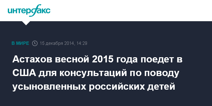 "До сих пор не создан реестр наших усыновленных детей, а их 61260 человек, хотя во время моего последнего визита в США американская сторона обещала его создать и предоставить. Весной 2015 года мы планируем совместно со Следственным комитетом и МИД РФ в составе делегации посетить США для консультаций", - цитирует пресс-служба слова российского омбудсмена Астахова в сообщении, поступившем в "Интерфакс" в понедельник.