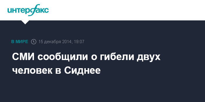 Москва. 15 декабря. INTERFAX.RU - Два человека погибли в результате захвата заложников в австралийском Сиднее, сообщает Channel Seven. Еще как минимум три человека ранены.