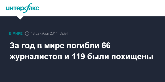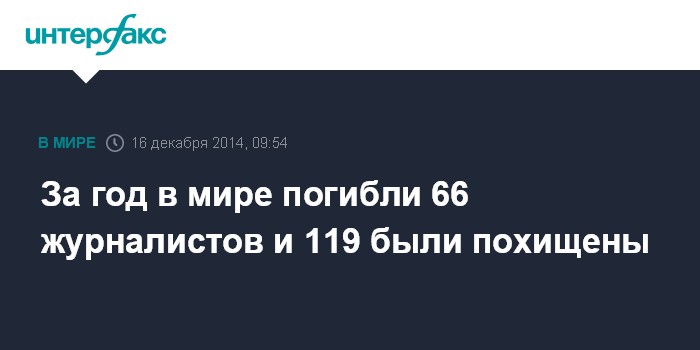 Москва. 16 декабря. INTERFAX.RU - За уходящий год в мире погибли 66 журналистов, 119 были похищены, сообщила во вторник в своем докладе организация "Репортеры без границ".