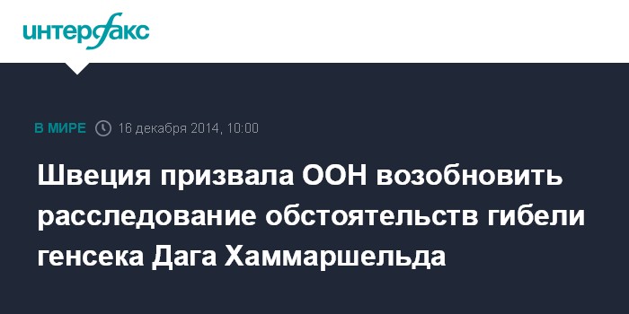 Москва. 16 декабря. INTERFAX.RU - Постпред Швеции при ООН Пер Торессон обратился к Генассамблее с призывом одобрить предложенный им проект резолюции, который предусматривает возобновление расследования гибели генсека ООН Дага Хаммаршельда в авиакатастрофе в 1961 году.
