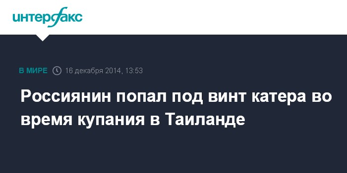 Москва. 16 декабря. INTERFAX.RU - Турист из России, отдыхавший в Пхукете, во время купания попал под винт катера и получил серьезные травмы, сообщает во вторник Phuket Wan.