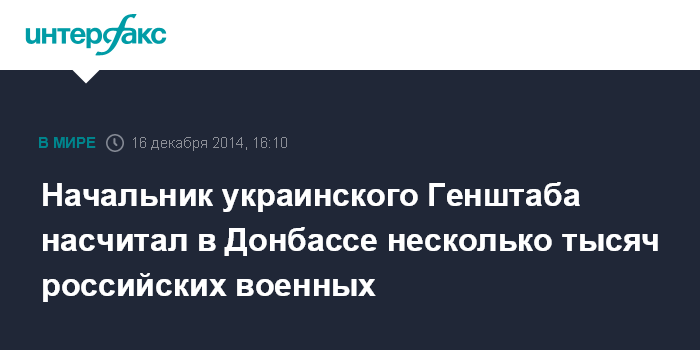 Москва. 16 декабря. INTERFAX.RU - Начальник Генштаба Вооруженных сил Украины Виктор Муженко заявил, что, по некоторым оценкам, в зоне военной операции в Донбассе находятся несколько тысяч российских военнослужащих.