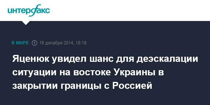 Москва. 16 декабря. INTERFAX.RU - Украинский премьер Арсений Яценюк заявил, что закрытие границы с Россией даст реальные шансы для деэскалации ситуации на востоке страны.
