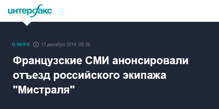 Москва. 17 декабря. INTERFAX.RU - 400 российских моряков, которых обучали обслуживать корабли класса "Мистраль", покинут порт Сен-Назер. Об этом пишет Ouest-France.