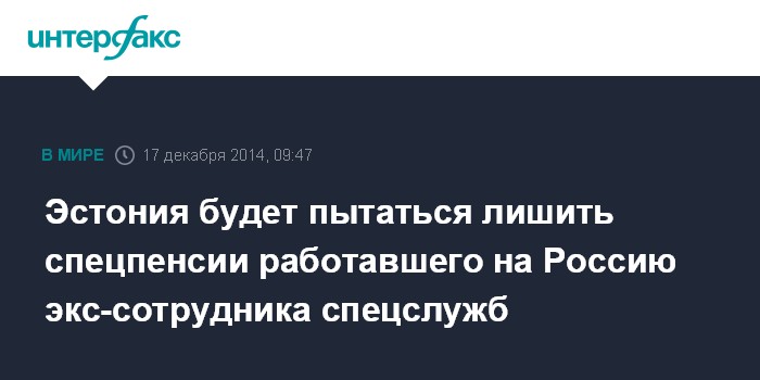 Москва. 17 декабря. INTERFAX.RU - В Эстонии не знают, как лишить бывшего сотрудника полиции безопасности, раскрывшего себя как агента ФСБ России Уно Пуусеппа, специальной повышенной пенсии.