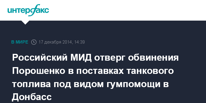 Москва. 17 декабря. INTERFAX.RU - Заявление президента Украины Петра Порошенко о том, что Россия под видом гуманитарной помощи поставляет ополченцам Донбасса топливо для танков и материалы для создания блокпостов, не имеет под собой оснований, заявил замглавы МИД Григорий Карасин.