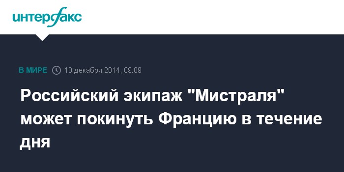 Москва. 18 декабря. INTERFAX.RU - 400 российских моряков, ожидавших во Франции передачу вертолетоносца "Мистраль", возможно, покинут страну уже в течение четверга, сообщает Ouest France со ссылкой на собственные источники.