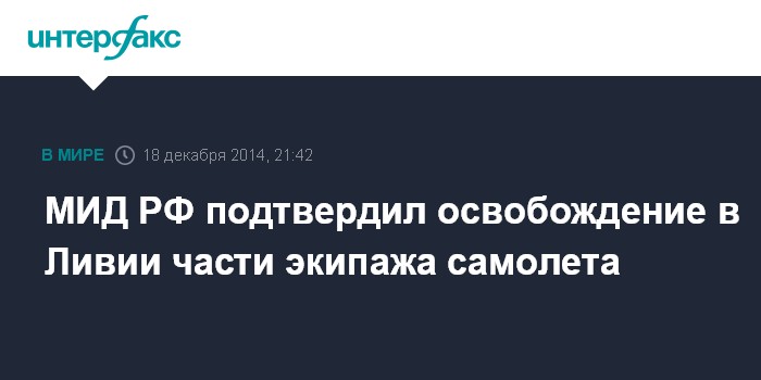 Москва. 18 декабря. INTERFAX.RU - Часть членов экипажа задержанного 13 ноября в ливийском городе Гадамесе самолета авиакомпании Route Aviation, среди которых россиянин, освобождена.