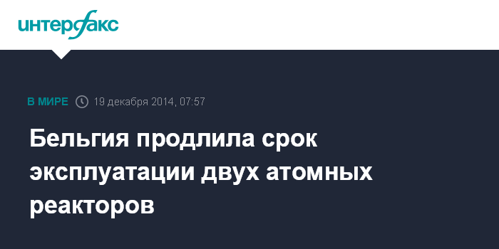 Москва. 19 декабря. INTERFAX.RU - Правительство Бельгии в четверг объявило о продлении срока эксплуатации двух атомных реакторов, которые предполагалось закрыть в следующем году, сообщает France Press.