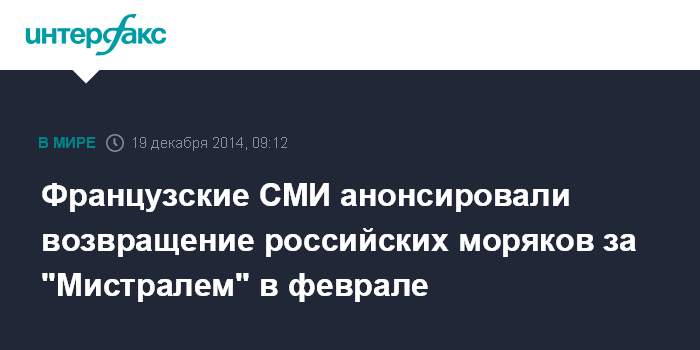 Москва. 19 декабря. INTERFAX.RU - Моряки из РФ, возможно, вернутся во Францию за вертолетоносцем "Мистраль" в феврале, сообщила в пятницу французская радиостанция RFI.