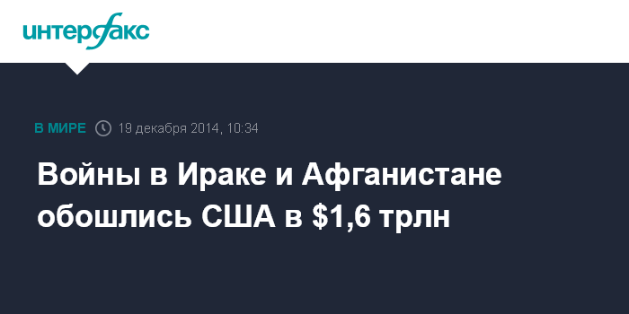 Москва. 19 декабря. INTERFAX.RU - Власти США потратили около $1,6 трлн на боевые действия и борьбу против терроризма в Ираке и Афганистане, говорится в докладе Исследовательской службы конгресса.