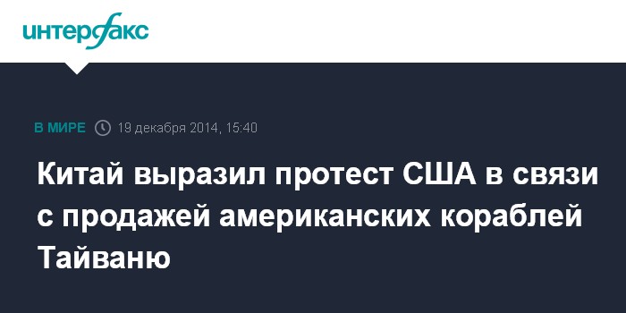 Москва. 19 декабря. INTERFAX.RU - Китай выразил протест США по поводу одобрения продажи Вашингтоном Тайваню нескольких фрегатов, сообщают государственные СМИ.