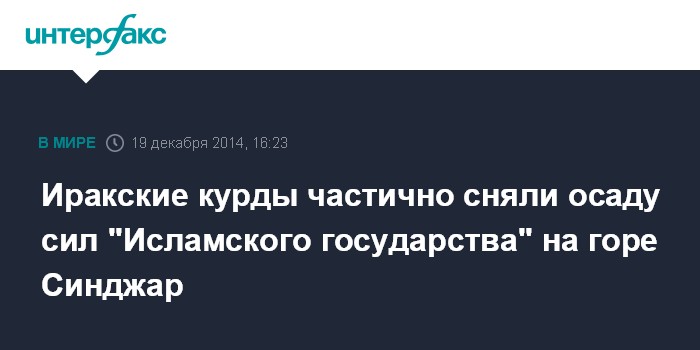 Москва. 19 декабря. INTERFAX.RU - Курдское ополчение "пешмерга" сумело частично снять осаду сил "Исламского государства" на горе Синджар, сообщает в пятницу BBC.