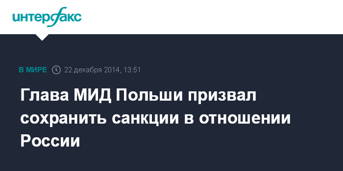 Москва. 22 декабря. INTERFAX.RU - Министр иностранных дел Польши Гжегож Схетына призвал страны Евросоюза действовать единым фронтом в вопросе введения ограничительных мер против России, чтобы побудить Москву изменить свою позицию по Украине, сообщает в понедельник Bloomberg.