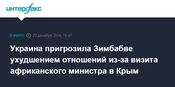 Москва. 22 декабря. INTERFAX.RU - Министерство иностранных дел Украины выразило протест Зимбабве в связи с посещением Крыма министром окружающей среды, водных ресурсов и климата африканской страны Сейвиором Касукувере.