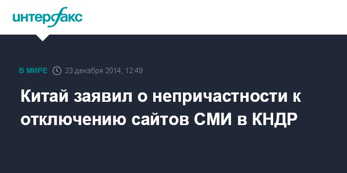 Москва. 23 декабря. INTERFAX.RU - Китай не имеет отношения к отключению веб-сайтов ряда северокорейских СМИ, сообщила во вторник официальный представитель МИД КНР Хуа Чуньин.