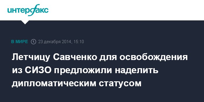 Москва. 23 декабря. INTERFAX.RU - Предоставление дипломатического статуса народному депутату Украины Надежде Савченко не позволит России и дальше содержать ее под стражей по обвинению в причастности к убийству российских журналистов, считает сестра украинской летчицы Вера Савченко.