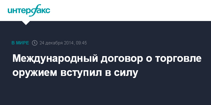 Москва. 24 декабря. INTERFAX.RU - Международный договор о торговле оружием (МДТО) официально вступил в среду в силу, сообщают западные СМИ.