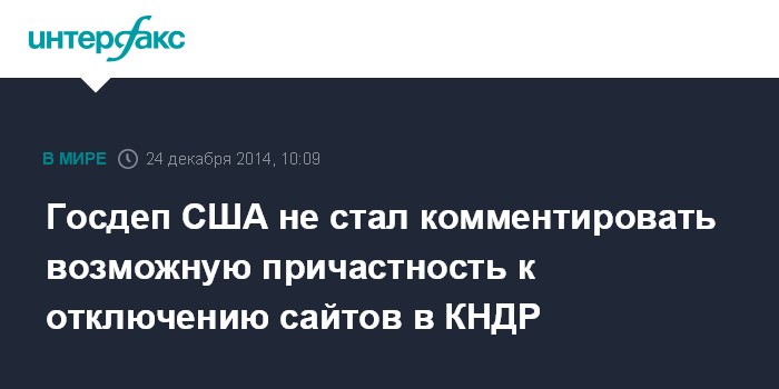 Москва. 24 декабря. INTERFAX.RU - Представитель госдепа США Мари Харф отказалась комментировать предположения о том, что отключение интернета в Северной Корее было спровоцировано Вашингтоном.