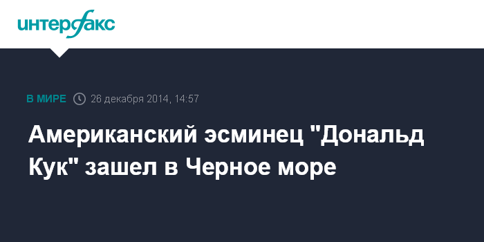 Москва. 26 декабря. INTERFAX.RU - Эсминец ВМС США с управляемым ракетным вооружением "Дональд Кук" войдет в пятницу в акваторию Черного моря для обеспечения мира и стабильности в регионе, говорится в сообщении на сайте 6-го американского флота.