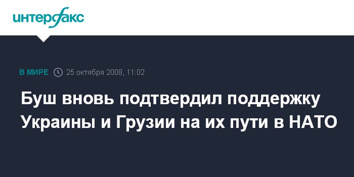 Москва. 25 октября. INTERFAX.RU - Президент США Джордж Буш вновь заверил Украину и Грузию в поддержке их вступления в НАТО невзирая на сопротивление России.