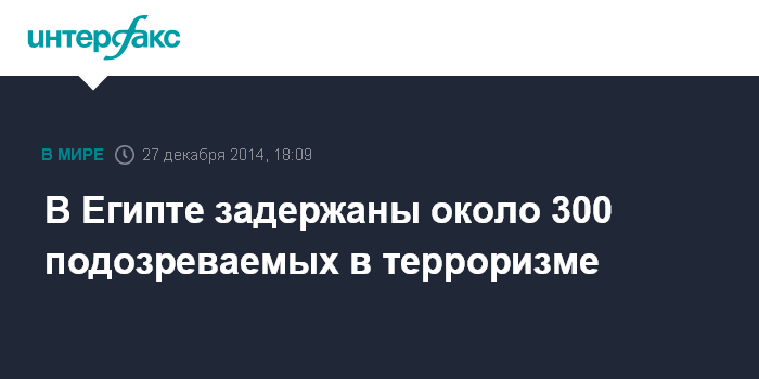 Москва. 27 декабря. INTERFAX.RU - Египетские военнослужащие задержали на севере Синайского полуострова 297 человек, подозреваемых в террористических преступлениях, говорится в коммюнике египетской армии, опубликованном в пятницу.