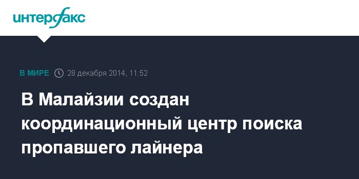 Москва. 28 декабря. INTERFAX.RU - Координационный центр по ведению поисково-спасательной операции в связи с исчезновением самолета авиакомпании AirAsia открыт в аэропорту Субанг малайзийской столицы Куала-Лумпура, сообщил в воскресенье министр транспорта Малайзии Лиоу Тионг Лай. "Малайзийское правительство сформировало центр по поиску и спасению в Субанге", - заявил он.