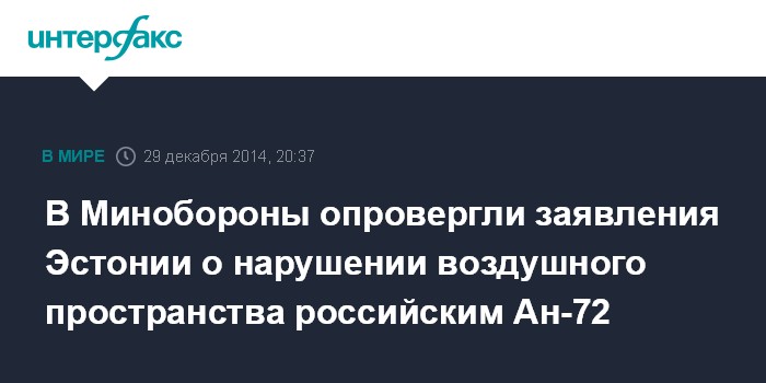 "25 декабря 2014 года военно-транспортный самолет Ан-72 Минобороны России совершал плановый полет из Санкт-Петербурга в Калининградскую область. Полет проходил по установленному маршруту над нейтральными водами Балтийского моря в строгом соответствии с международными правилами, без нарушения границ воздушного пространства Эстонии и других государств", - сообщили в управлении пресс-службы и информации министерства обороны России.