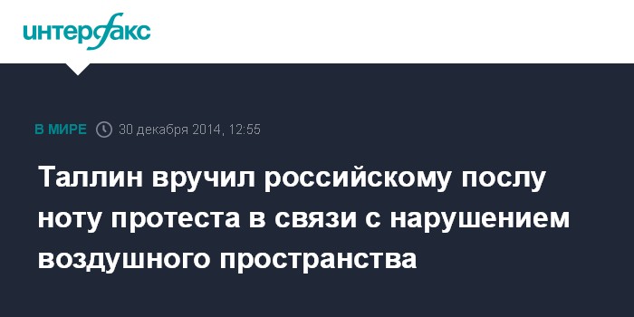 Москва. 30 декабря. INTERFAX.RU - Министерство иностранных дел Эстонии во вторник вызвало посла России в Таллине, чтобы передать ему ноту протеста и выразить возмущение нарушением эстонского воздушного пространства.