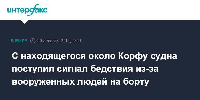 Москва. 30 декабря. INTERFAX.RU - Экипаж судна, находящегося около греческого острова Корфу, подал сигнал бедствия в связи с тем, что на борту могут находиться вооруженные люди, сообщает во вторник греческое государственное телевидение.