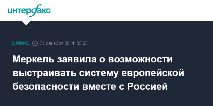 Москва. 31 декабря. INTERFAX.RU - Канцлер Германии Ангела Меркель считает, что безопасность в Европе возможна во взаимодействии с Россией, однако при этом критикует российскую политику в отношении Украины.