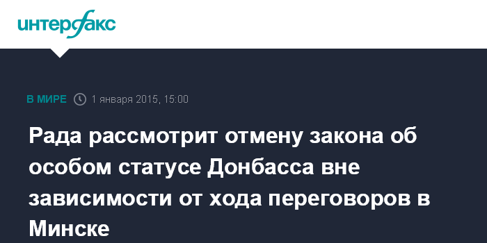 Москва. 1 января. INTERFAX.RU - Верховная Рада Украины рассмотрит отмену закона об особом порядке местного самоуправления в Донецкой и Луганской областях, заявляет председатель парламента Владимир Гройсман.
