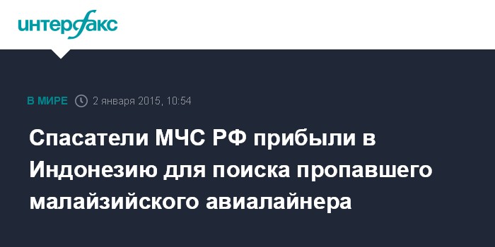 Москва. 2 января. INTERFAX.RU - Сводный отряд спасателей МЧС России со специальным оборудованием прибыл в Индонезию для оказания помощи в поиске пропавшего малайзийского аэробуса.