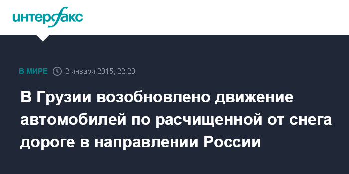 Москва. 2 января. INTERFAX.RU - Работы по расчистке снега, проводившиеся в течение дня на участке Гудаури-Коби автомагистрали Мцхета-Степанцминда-Ларс (Военно-Грузинская дорога), к вечеру в пятницу позволили возобновить движение автотранспорта из Грузии в направлении России.
