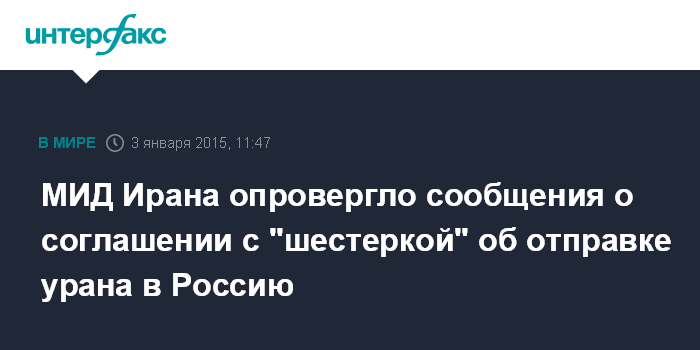 Москва. 3 января. INTERFAX.RU - Власти Ирана опровергли сообщения западных СМИ о том, что якобы Тегеран и "шестерка" международных посредников пришли к соглашению относительно отправки обогащенного урана в Россию, сообщает в субботу иранский телеканал Press TV со ссылкой на представителя МИД Ирана Марзие Афкам.