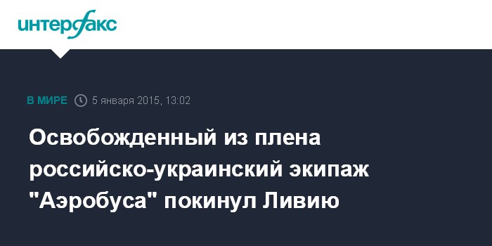 Москва. 5 января. INTERFAX.RU - Освобождение из ливийского плена члены экипажа самолета Аэробус-300, который перевозил гуманитарный груз, покинули Ливию.