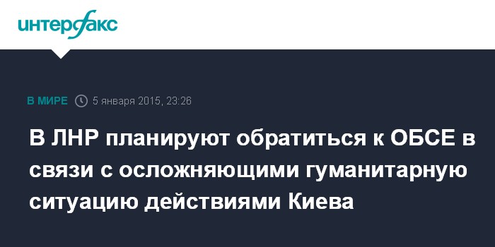 Москва. 5 января. INTERFAX.RU - В руководстве самопровозглашенной Луганской народной республики обвиняют Киев в ухудшении гуманитарной обстановки в регионе.
