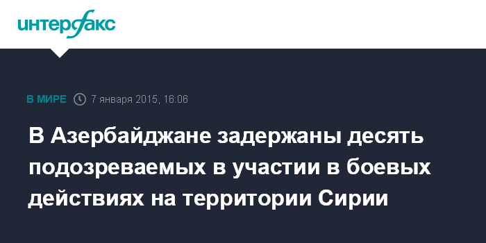 Москва. 7 января. INTERFAX.RU - Сотрудники Министерства национальной безопасности Азербайджана задержали по подозрению в деятельности в составе незаконных вооруженных формирований на территории Сирии десять азербайджанских граждан, сообщает центр общественных связей ведомства.