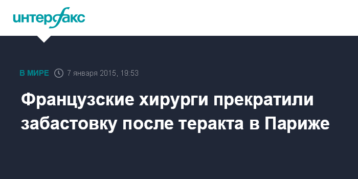 Москва. 7 января. INTERFAX.RU - Профсоюз хирургов Франции объявил о прекращении забастовки в связи с терактом в Париже, пишет в среду Le Figaro.