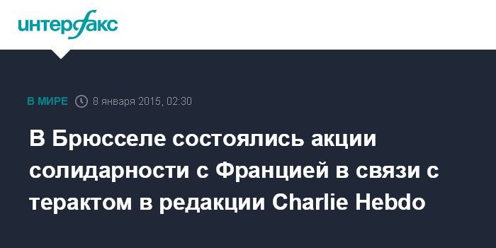 Москва. 8 января. INTERFAX.RU - Две многолюдных акции солидарности с Францией прошли вечером в среду в Брюсселе в память о жертвах расстрела в редакции французского журнала "Шарли Эбдо" в Париже, передает корреспондент "Интерфакса".