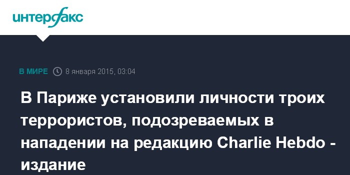 Москва. 8 января. INTERFAX.RU - Личности троих мужчин, предположительно, совершивших нападение на редакцию "Шарли Эбдо" в Париже, установлены, пишет в четверг газета "Либерасьон".